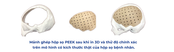 Mảnh ghép hộp sọ PEEK là thiết bị tạo hình khuyết sọ được chế tạo từ công nghệ và vật liệu tiên tiến nhất hiện nay trên thế gới. Thiết bị đáp ứng yêu cầu về chức năng và thẩm mỹ cho người bệnh, đồng thời thao tác dễ dàng, nhanh chóng cho bác sỹ phẫu thuật